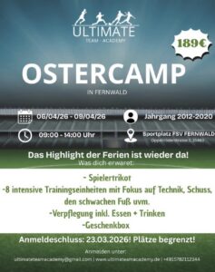 Ostercamp Fernwald: 06.04-09.04.2026 Sportplatz FSV Fernwald Das Highlight der Ferien ist wieder da!4 lehrreiche Tage voller Spaß, mit vielen Überraschungen und intensivem Training mit Fokus auf Schusstraining, Technik und dem schwachem Fuß.