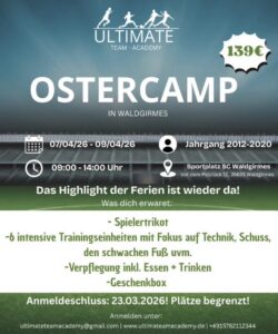 Ostercamp Waldgirmes: 07.04-09.04.2026 Sportplatz SC Waldgirmes Das Highlight der Ferien ist wieder da! 3 lehrreiche Tage voller Spaß, mit vielen Überraschungen und intensivem Training mit Fokus auf Schusstraining, Technik und dem schwachem Fuß. - Ostercamp Fernwald